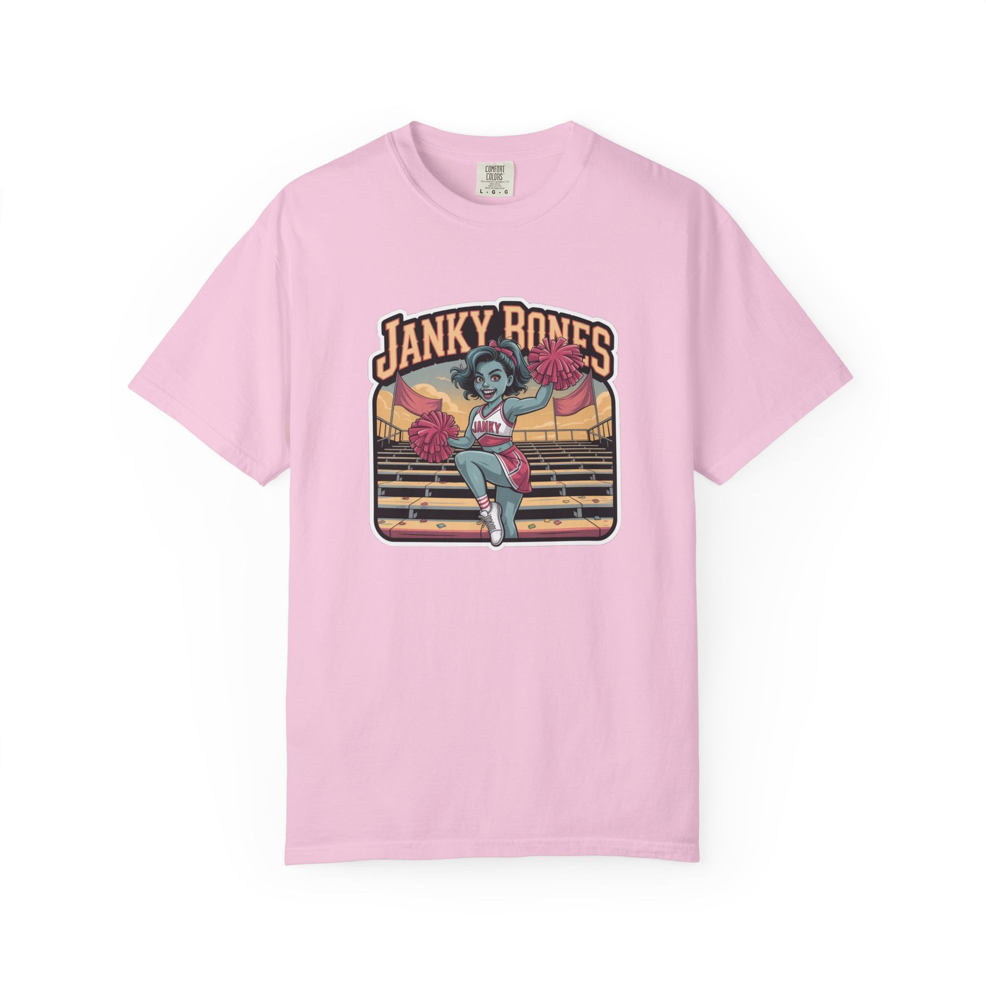 She's got spirit, guts, and just a little bit of decay! This zombie cheerleader is ready to slay the sidelines in true Janky Bones fashion. A perfect pick for horror fans, Halloween lovers, or anyone who cheers with a spooky flair. Printed on a Comfort Colors Tee.